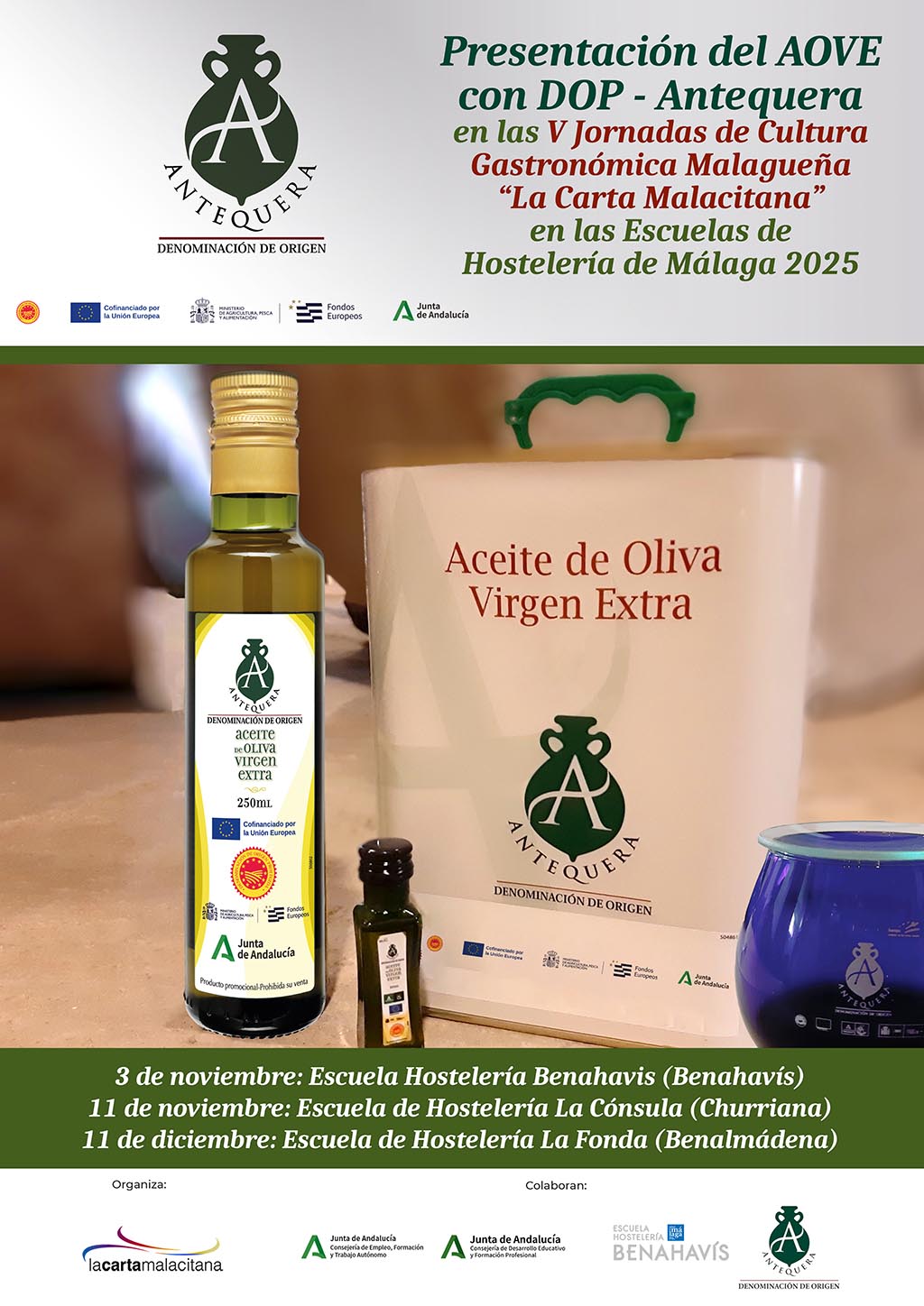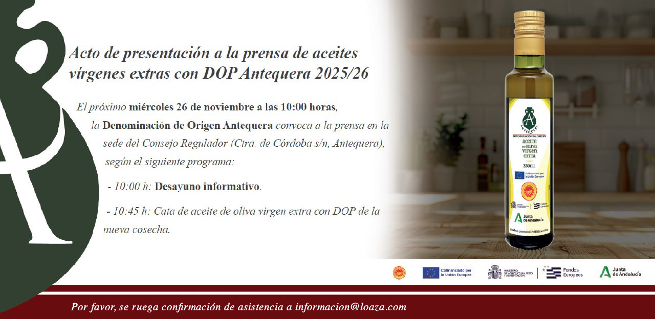 Con arreglo a la orden de 5 de septiembre de 2024, por la que se modifica la Orden de 8 de abril de 2024, por la que se aprueban las bases reguladoras aplicables a las Intervenciones de Desarrollo Rural no SIGC de la Consejería de Agricultura, Pesca, Agua y Desarrollo Rural, para la concesión de subvenciones en régimen de concurrencia competitiva del Plan Estratégico de la Política Agracia Común 2023-2027 y se modifica la Orden de 21 de octubre de 2019, relativa al procedimiento para la habilitación de entidades para la presentación y tramitación electrónica de las solicitudes de todo tipo de subvenciones y ayudas, se realiza esta campaña promocional de la Denominación de Origen Protegida (DOP) Antequera para la anualidad 2024/2025, según la resolución del 20 de diciembre de 2024 (BOJA del 14 de enero de 2025) relativa a las ayudas dirigidas a la cooperación para la promoción de los productos agrícolas y alimenticios en régimen de calidad (intervención 7132) del PEPAC 2023-2027.