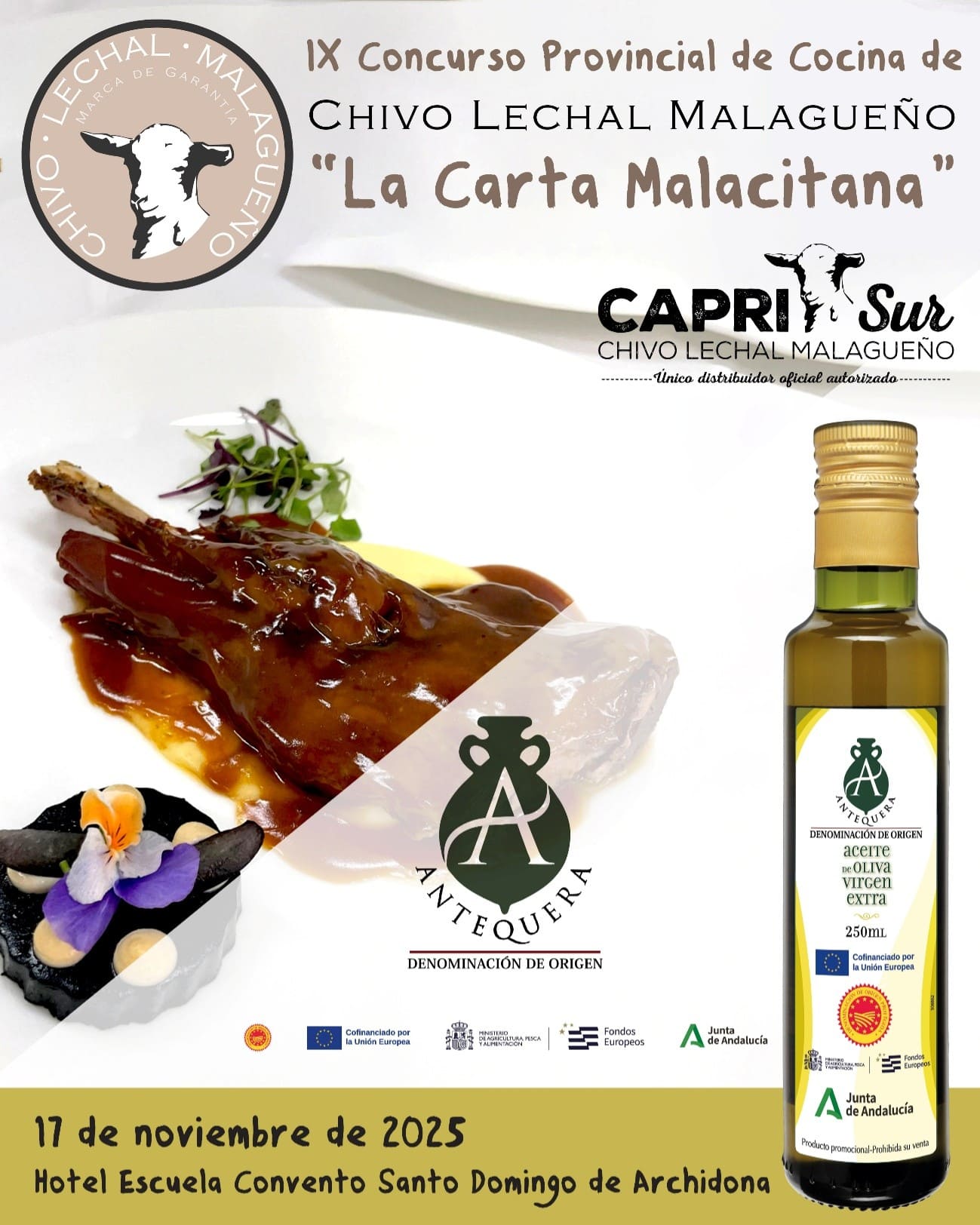 Presentación y cocinado de varios restaurantes participantes utilizando nuestros AOVEs con DOP Antequera en el IX Concurso provincial de cocina de Chivo Lechal Malagueño, a través de la asociación gastronómica La Carta Malacitana. La final se celebrará el día 17 de noviembre a las 10h en la Escuela de Hostelería de Archidona.